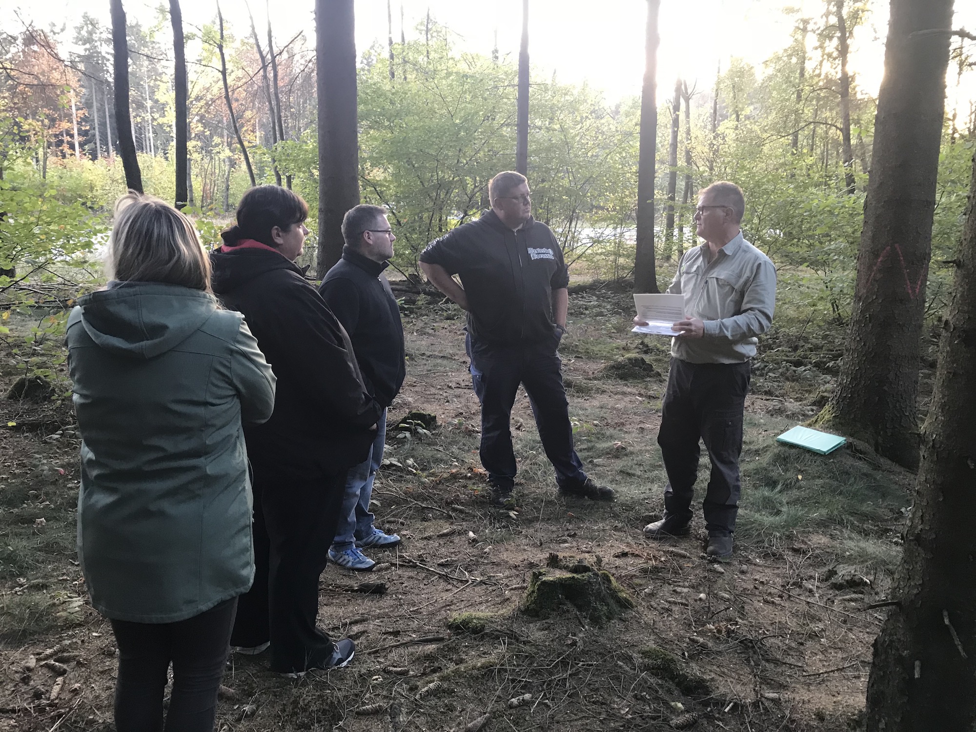 Nach dem Sturmtief Fabienne war uns das Wetter für den diesjährigen Waldbegang dann wieder hold. Pünktlich um 18.00 Uhr traf sich der Gemeinderat am DGH inkl. Förster – interessierte Bürger*innen gab es in diesem Jahr nicht, schade, es gab super spannende Geschichten und Infos zu erfahren. In kleinen Fahrgemeinschaften haben wir uns dann mit unserem Förster, Otmar Esper, auf den Weg in die Gemarkung gemacht. Scherpunktthema war in diesem Jahr der Borkenkäfer, der gerade bei uns sein Unwesen treibt und für erhebliche Schäden im Wald sorgt.