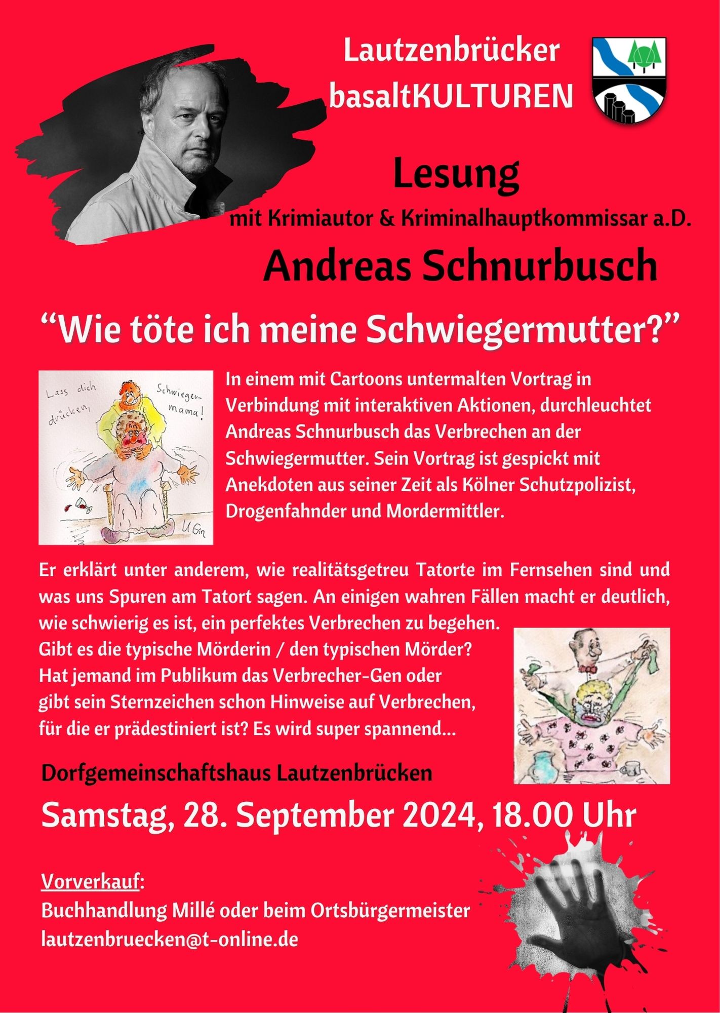 Nach dem Sommerkonzert geht es in unserer Kulturreihe „Lautzenbrücker basaltKULTUREN“ weiter, dieses Mal wieder mit einer Krimilesung der besonderen Art. Was darf einen wohl erraten, wenn es heißt: „Wie töte ich meine Schwiegermutter“? Krimiautor und gleichzeitig (echter) ehemaliger Kriminalkommissar Andreas Schnurbusch wird dieser Frage auf den Grundgehen – das wird superspannend. Die Karten bekommt ihr […]