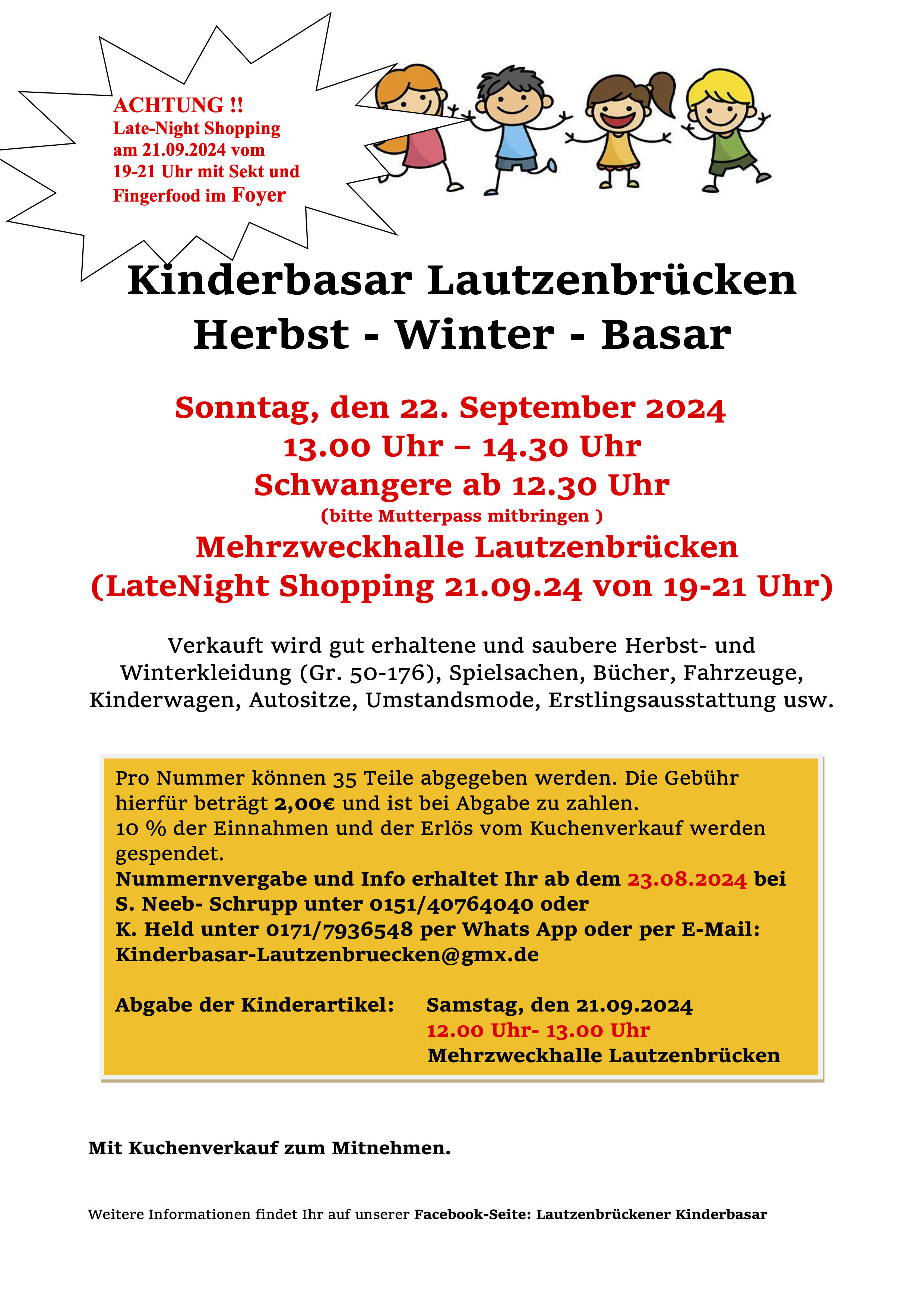 Es ist wieder so weit, der nächste Kinderbasar steigt in Lautzenbrücken. Die Nummernvergabe hat bereits begonnen, also sputet euch, wenn ihr verkaufen möchtet. Achtet auch wieder auf die Sonder-Events wie Late-Night-Shopping oder das „Early-Bird-Shopping“ für Schwangere. Alle Infos hier: