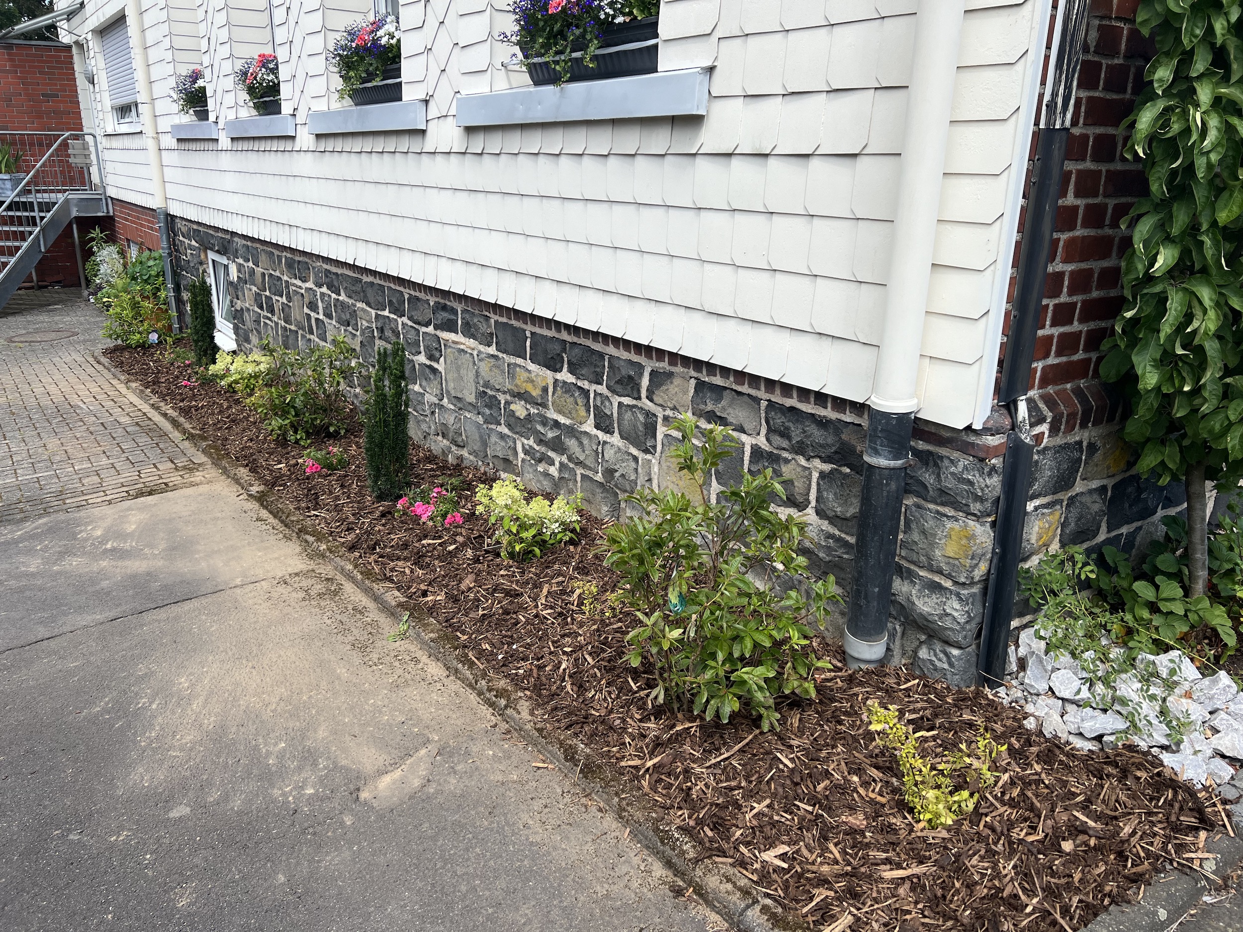 Leider hat es die uralte, strubbelige Hecke am DGH nicht mehr länger geschafft. Mit der Hecke war allerdings auch optisch kein Preis mehr zu gewinnen. Deshalb haben wir den Seitenstreifen unter den Fenstern am DGH jetzt einmal komplett neu angelegt. Und? Gefällt?