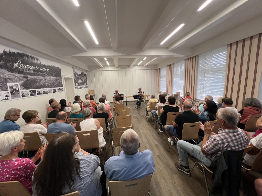 Und weil Walter in seiner alten Heimat, sogar in seiner alten Schule, wo er vor 80 Jahren eingeschult wurde, auftrat, haben es sich viele Verwandte von Walter nicht nehmen lassen, dem Abend beizuwohnen, Montabaur, Düsseldorf und Allgäu, von überall sind sie hergekommen. Und auch mit vielen alten Lautzenbrückerinnen und Lautzenbrückern wurde danach in der Vergangenheit geschwelgt. Auf den historischen Aufnahmen im DGH wurde Personen wiedererkannt und das im Nebengebäude des DGH, wo jetzt Garagen und Öltanks sind, früher mal das stille Örtchen war, weiß auch nur die ältere Generation.