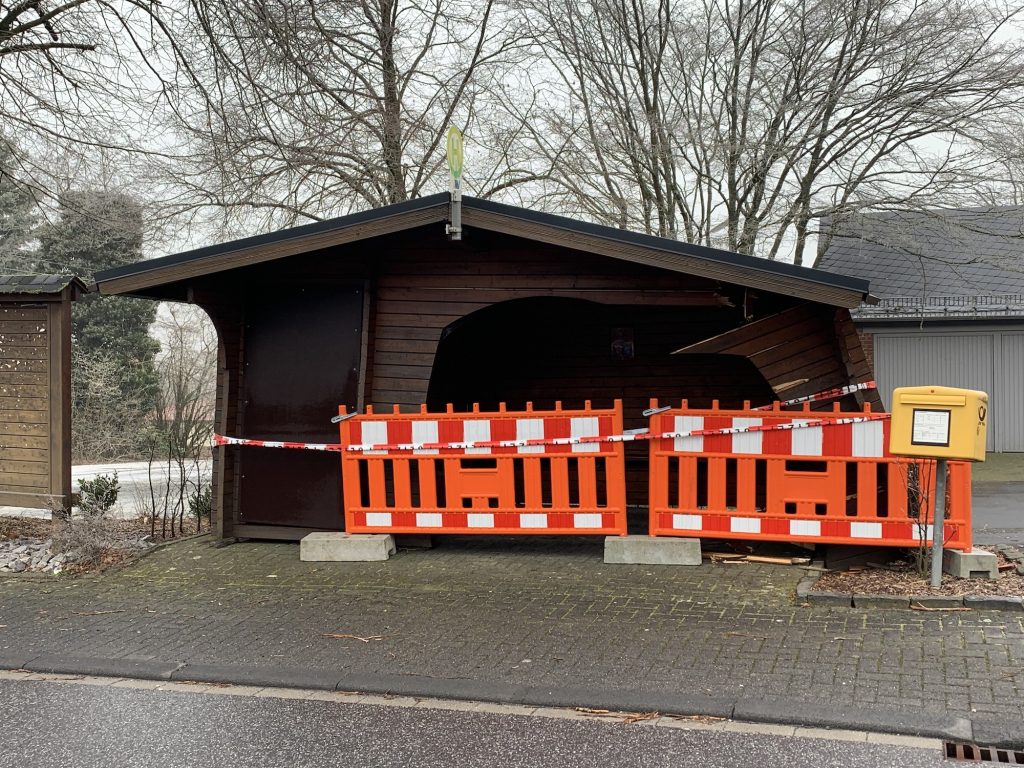 In sich ist die Haltestelle noch sehr stabil, wir haben sie zur Sicherheit dennoch abgesperrt und unzugänglich gemacht. Sagt es auch an Eure Kinder weiter, dass die Absperrung einen Sinn hat und sie jetzt nicht anfangen darüber zu klettern. Wir haben bereits Ersatzmöglichkeiten geprüft, aber so richtig sinnvolle Lösungen haben sich nicht ergeben und bis die neue Haltestelle stehen wird, werden sicher ein paar Wochen ins Land ziehen. Daher müssen die Kinder, wenn sie morgens auf den Bus warten, mit Schirm und Regenjacke ausgestattet werden, weil sie sich vorerst eben nicht mehr unterstellen können. Wenn es doch noch eine Lösung gibt, die auch 100%ig sicher ist, dann machen wir das natürlich, wir prüfen das gerade weiter.