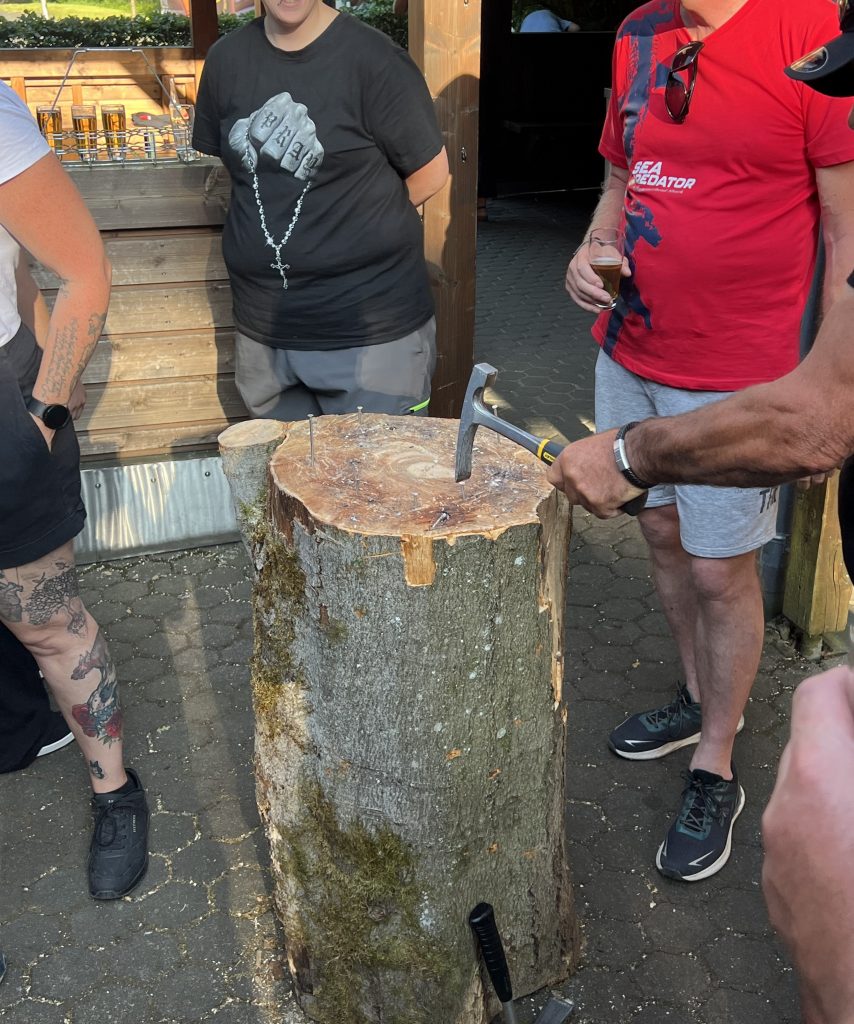 Der Menschen-Mega-Kicker hingegen floppte. Den Kindern war es in der Sonne zu heiß und die Erwachsenen hatte offensichtlich besseres zu tun als gegen den Ball zu kicken. Um es klar zu sagen: Es war wieder einmal spannender einen Nagel in einen Holzstamm zu rammen, immer gut, wenn Menschen mit ganz wenig, ganz glücklich werden. Ein kleines Turnier beim Kicker hätte vielleicht geholfen, man weiß es nicht, mal sehen, vielleicht ein anderes Mal.