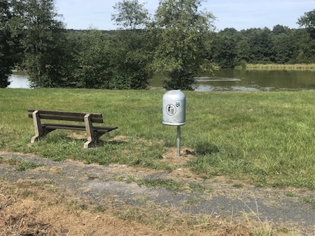 Die Mülleimer sind an folgenden Stellen aufgestellt, falls Euch die Fotos das nicht schon verraten: Direkt am Weiher, vom Weiher aus Richtung Nisterberg an der Kreuzung mit der Bank, wo der Weg wieder nach oben ins Dorf geht („Oberste und Unterste Große Wiese“), im „Großen Garten“ oberhalb vom Dorf und „In den Schafställen“ oberhalb der Mecky Ranch. Und ein erster Check hat ergeben, die Mülleimer werden genutzt, von Hundebesitzer*innen und auch mit sonstigem Müll. Super, wenn das so klappt, ist das ein Gewinn für alle.