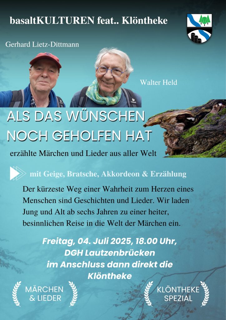 Unsere kleine Kulturreihe „Lautzenbrücker basaltKULTUREN“ in Kombi mit der Klöntheke und das noch auf besondere Art und Weise. Walter Held, ein Ur-Lautzenbrücker, kehrt mit seinem Freund zu uns ins Dorf zurück, um Märchen und Lieder mit Geige, Bratsche und Akkordeon zu präsentieren.