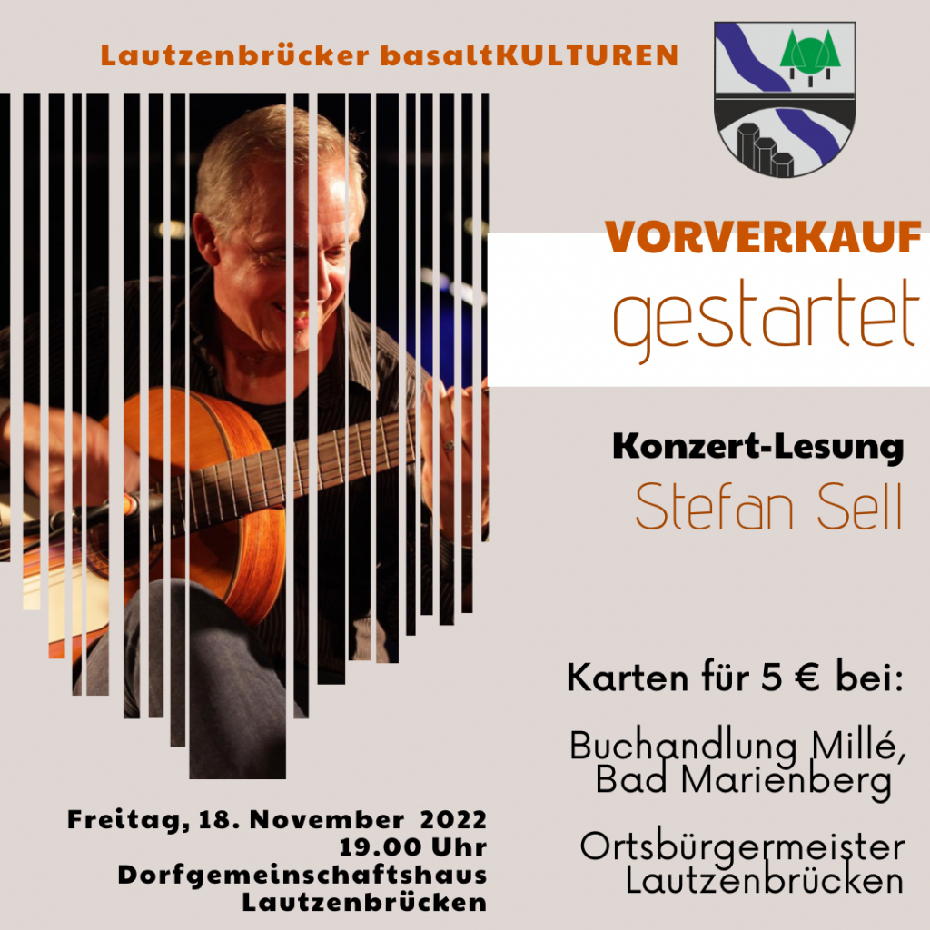 So, jetzt kann es losgehen, der Kartenvorverkauf für die Konzert-Lesung mit Stefan Sell im Rahmen der Kulturveranstaltungsreihe „Lautzenbrücker basaltKULTUREN“ ist gestartet. Die Karten können vor allen Dingen in der Buchhandlung Millé in Bad Marienberg erworben werden, gerne aber auch beim Ortsbürgermeister von Lautzenbrücken direkt. Kultur wird in Lautzenbrücken immer großzügig unterstützt, daher ist die Eintrittskarte schon für 5,00 € zu haben.
