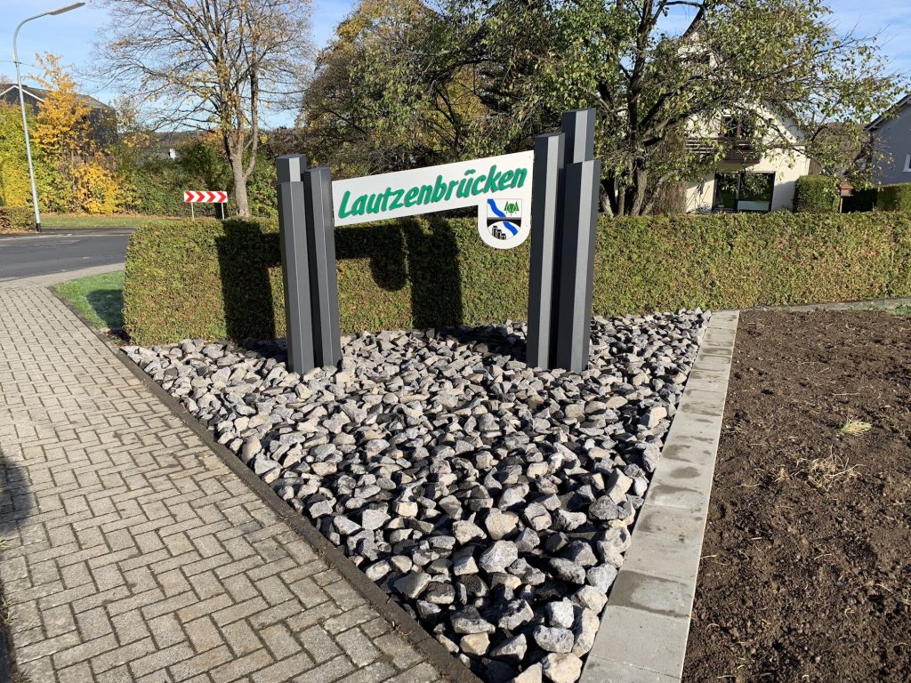 In jedem Fall gibt es nun neben dem offiziellen Ortseingangsschild auch eine individuelle Begrüßung. Sechs Basaltsäulen tragen einen schräglaufenden Namenszug unseres Dorfes mit unserem Wappen. Die Buchstaben sind in 3D aus Acrylglas, die Basaltsäulen aus Metall – das alles auf einem basaltgeschotterten Untergrund. Alle in den Farben gehalten, die mit dem Dorf und seiner Umgebung verbunden sind. Auf das es alle Ankömmlinge im Dorf gut willkommen heißt.