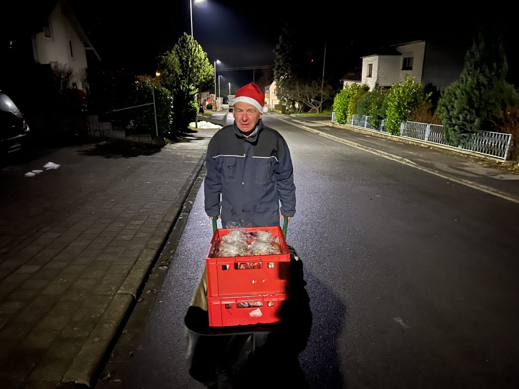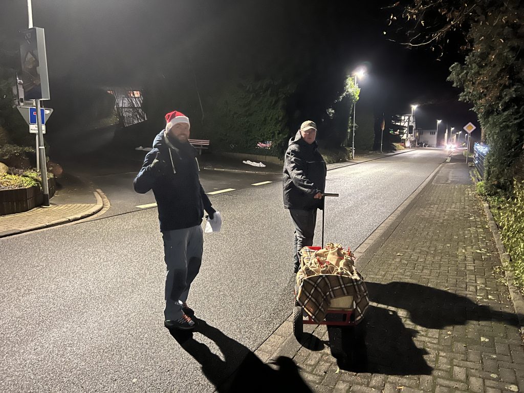 Bei frischer Luft und schon im Dunkeln ging es in Kleintrupps kreuz und quer durch das Dorf, um an so mancher Tür zu klingeln. Die Kleinen und jüngeren Dorfbewohner:innen wurden mit einem liebevoll gepackten Nikolaussäckchen überrascht, während unsere 65+ler mit einem weihnachtlichen Schlemmerkorb bedacht wurde. Dieser wurde bereichert durch einen persönlichen Weihnachtsgruß, der in der „Solbachschen Handwerksstube“ liebevoll gestaltet und gebastelt wurde. Bei den Säckchen hatte der Nikolaus die volle Unterstützung von Katrin aus dem Gemeinderat. An beide ein großer Dank, super Einsatz. Für das erhellende Licht zur Weihnachtzeit sorgte bei den Senioren:innen zusätzlich eine kleine Leuchte aus dem Hause Pogacar, auch dafür besten Dank!