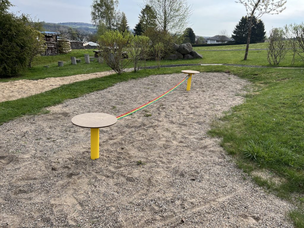 Jetzt gibt es hier eine Slackline, auf der man von Pfosten zu Pfosten balancieren muss. Die Fallhöhe ist dabei sehr zu vernachlässigen. Die ersten Tester:innen haben noch keinen Erfolg vermelden können, es hat also noch keiner geschafft, die Slackline erfolgreich zu überqueren. Das Ganze ist ein Spaß und eine Herausforderung für Groß und Klein. Viel Spaß bei Euren Versuchen die Slackline zu bezwingen.