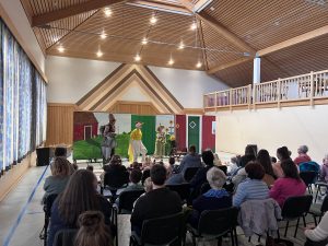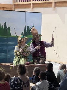 Die Kinder hatte die Möglichkeit ganz nah dran zu sein und konnte auf Turnmatten das Theater hautnah von der ersten Reihe aus erleben. Und nicht nur die Kinder hatten Spaß, auch den begleitenden Erwachsenen hat es offenbar gut gefallen, sah und hörte man doch immer wieder Schmunzler und Lacher über das Geschehen auf der Bühne. Über 70 Karten waren verkauft, die Mehrzweckhalle war also ordentlich gefüllt.