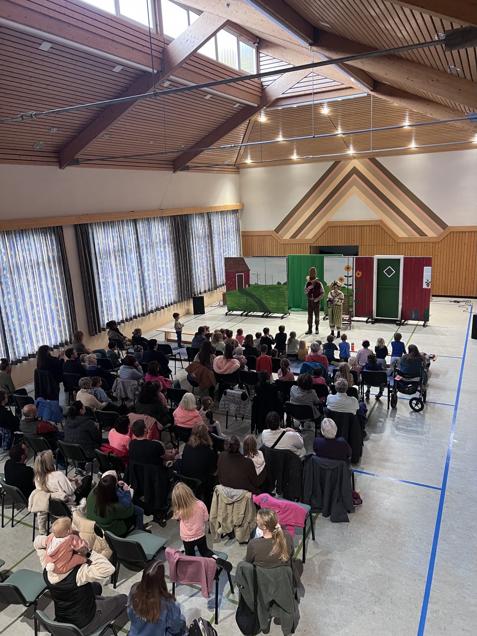 Die Kinder hatte die Möglichkeit ganz nah dran zu sein und konnte auf Turnmatten das Theater hautnah von der ersten Reihe aus erleben. Und nicht nur die Kinder hatten Spaß, auch den begleitenden Erwachsenen hat es offenbar gut gefallen, sah und hörte man doch immer wieder Schmunzler und Lacher über das Geschehen auf der Bühne. Über 70 Karten waren verkauft, die Mehrzweckhalle war also ordentlich gefüllt.