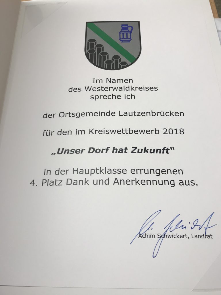 Man sagt dazu wohl Holz, knapp am Treppchen mit Gold, Silber und Bronze vorbei, aber dennoch daneben. Wir konnten der Jury dennoch viele tolle Projekte und Ideen präsentieren, die in den letzten Jahren in Lautzenbrücken umgesetzt wurden. Der Landrat hat der Ortsgemeinde dafür nun auch eine entsprechende Urkunde ausgestellt. Viele dieser Projekte wurden maßgeblich durch Euch, die Bürgerinnen und Bürgern, umgesetzt. Dazu zählen natürlich auch alle in der Gemeinde Beschäftigten und nicht zuletzt der Gemeinderat. Auch wenn es nicht zu Edelmetall gereicht hat, Ihr dürft zu Recht stolz auf Euren Einsatz sein und das, was Ihr geleistet habt. Ihr habt unser Dorf ein Stück weit lebenswerter und schöner gemacht und das ist es, was am Ende zählt.