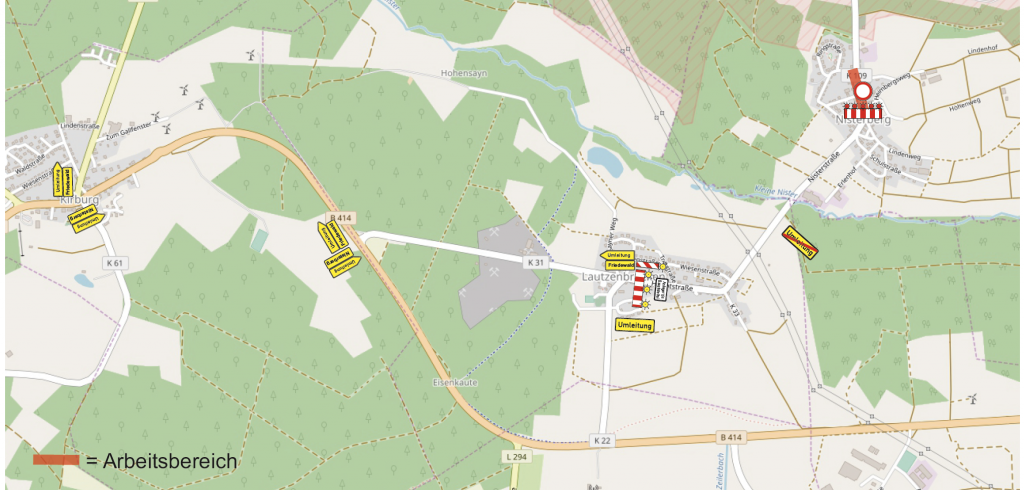 Die K 109 in der Ortslage Nisterberg sowie zwischen Nisterberg und Friedewald wird aufgrund von Fahrbahnsanierungsarbeiten in der Zeit vom 1.7. – 5.7.2019 für den Verkehr gesperrt werden muss.